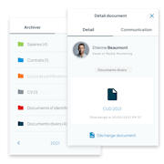 Plus besoin d’imprimer des piles de documents. Avec Fluida vous envoyez les documents au format numérique : fiches de paie, contrat de travail, attestation de formations à la sécurité, etc. le personnel reçoit directement sur son smartphone et tout reste stocké dans une archive toujours accessible aussi bien au responsable qu’au collaborateur.